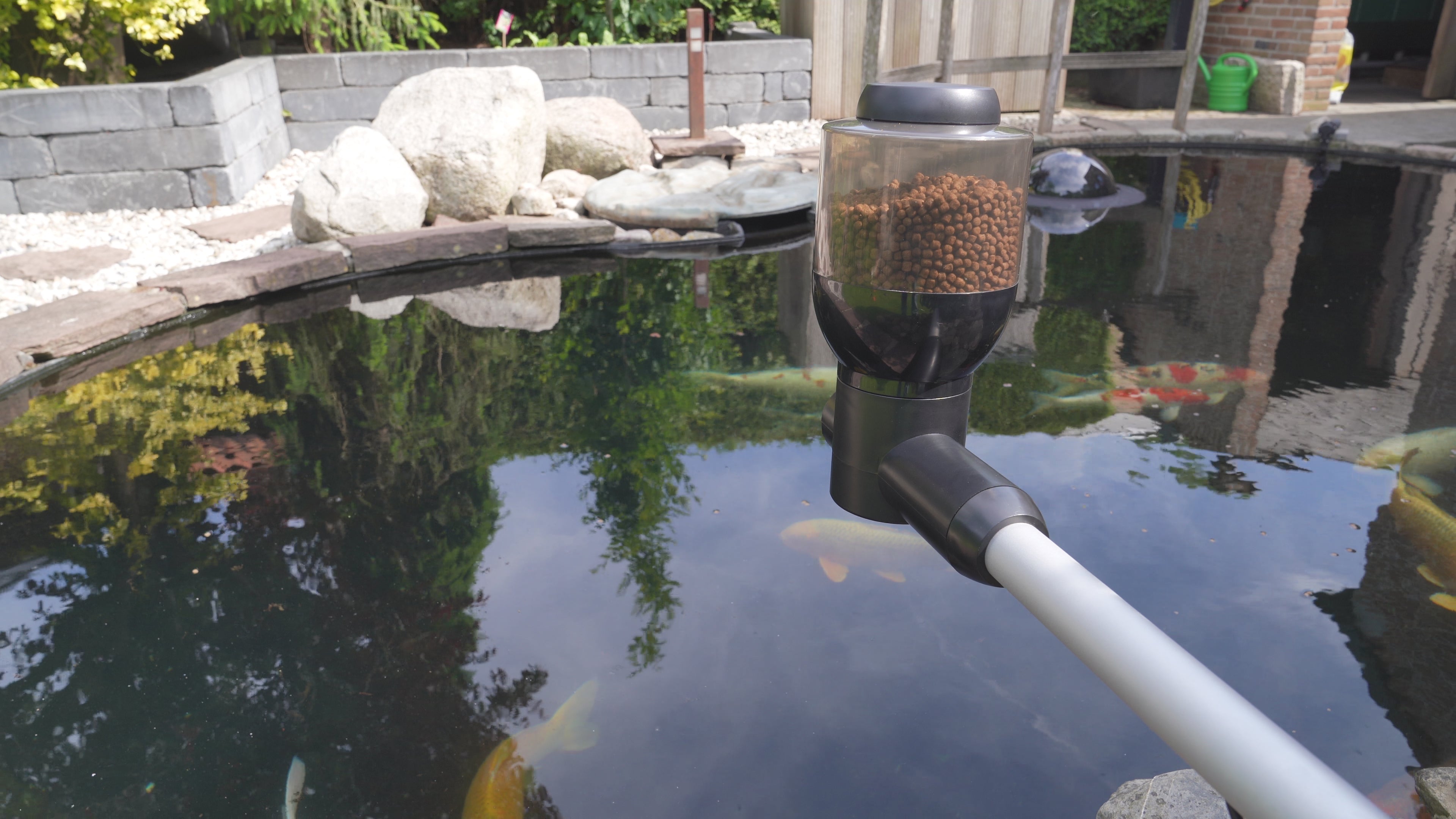 Der Fish Feeder Easy füttert Ihre Teichfische automatisch mit eingestellten Mengen bis zu 4 Mal am Tag. Zusätzlich zum programmierten Fütterungsplan ist über die Tastensteuerung immer eine zusätzliche Futterabgabe möglich. Nach einem Stromausfall (von 1 bis 1,5 Stunden) wird die Fütterung automatisch wieder aufgenommen. Während der Ferien und bei Abwesenheit, aber auch bei Wind und Wetter, werden Ihre Fische nicht vergessen.